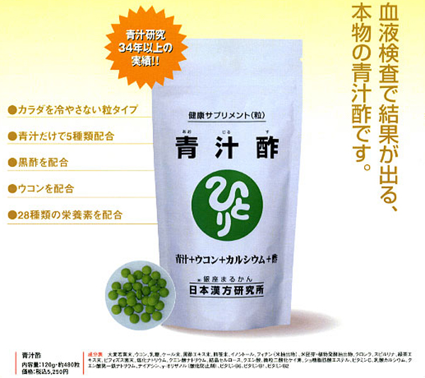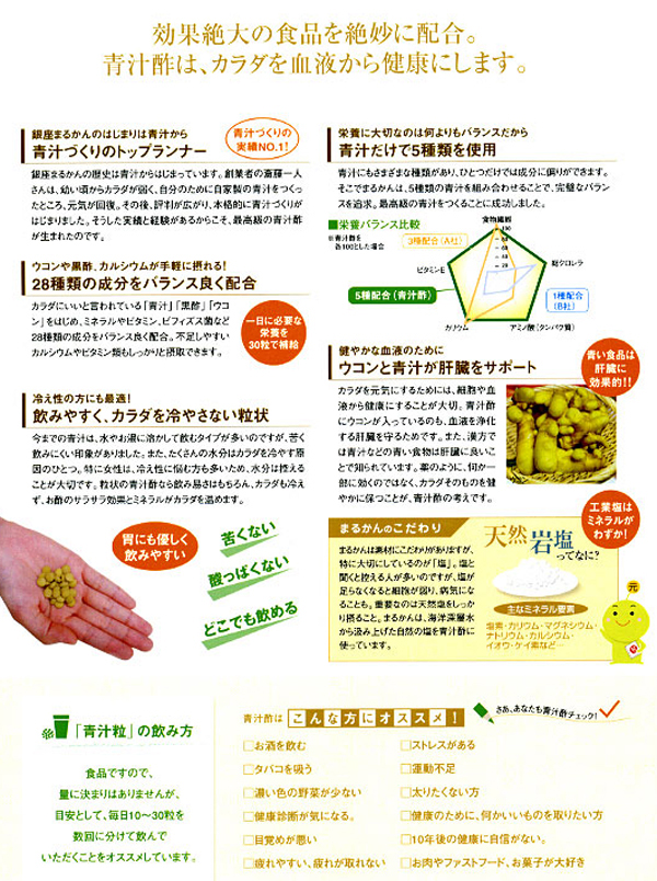 5種類の青汁、黒酢、ウコン、カルシウム、ビタミンなど多種配合の飲みやすい粒です。 大切な栄養バランスが簡単にとれます。肝臓の健康におススメです。 「青汁酢」は1日3回10粒飲用(1ヶ月約2袋)