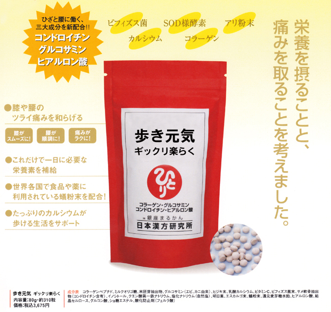 コラーゲン、グルコサミン、コンドロイチン、ヒアルロン酸、他、カルシウム、 ビフィズス菌、ビタミン、ミネラル多種配合!! 斎藤一人さんが20年かけて作り上げたサプリメントです。