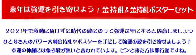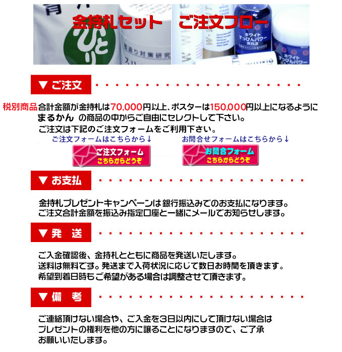 まとめ買いで強金運をプレゼント! どんな時も力になるのは健康とへこたれない強い心と後はツキ! サプリメントと開運を招く金持札が導いてくれます! 貼るとあなたのお部屋が金閣寺の茶室のように(?!) 照明つけてないのに何故だかそこだけ明るい! 凄いパワーの波動で空気がワクワクになりますよ。 *商売繁盛したい方 *人生上昇させたい方 *金運・財運アップさせたい方 激レアな「金持札」または「大判ポスター」をプレゼント! 2021年夏のボーナスキャンペーン(6/15〜7/30) ノーマルな金持札は今回で完売となりそうです。 欲しいと思っているひとりさんファンの方はお早めにどうぞ! 今や斎藤ひとりさんの金持札やポスターは幻の逸品。 希少になってきた為、高価で取引されているとか。 レアもの金持札は当店も残り僅かです。 この金持札やポスターは ひとりさんやまるかん商品を愛して下さる方々に お譲りしたいと思っています。
